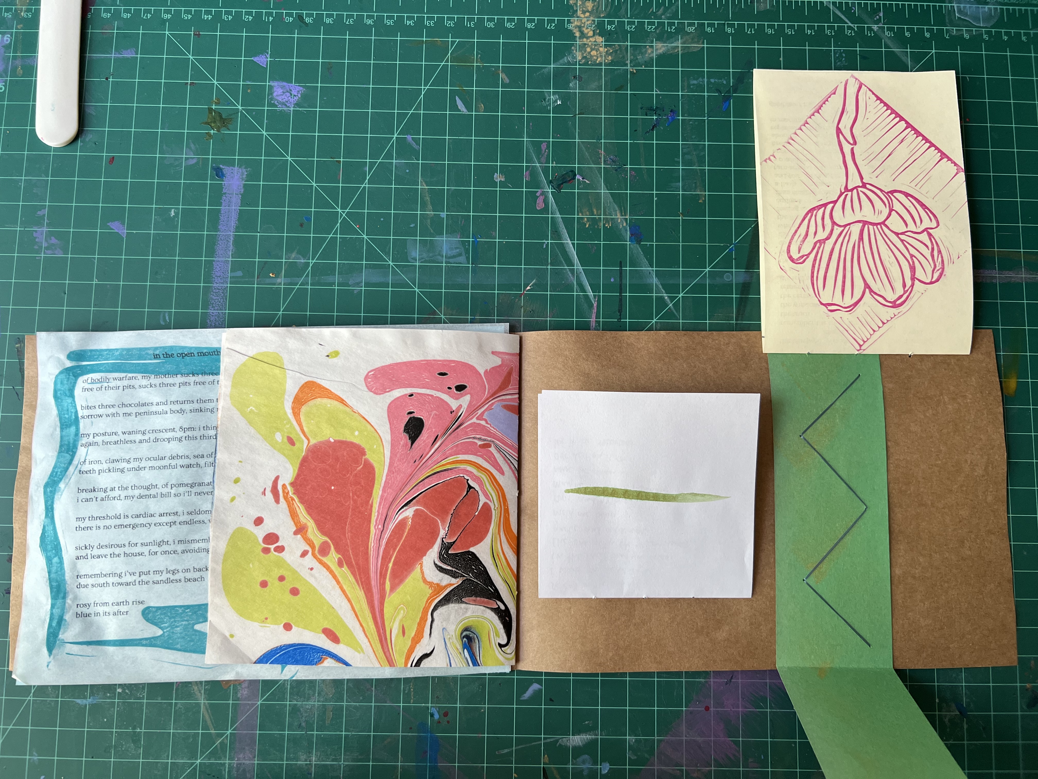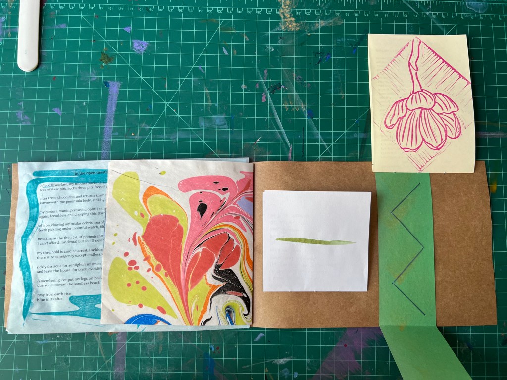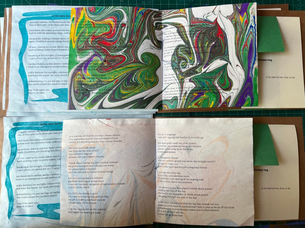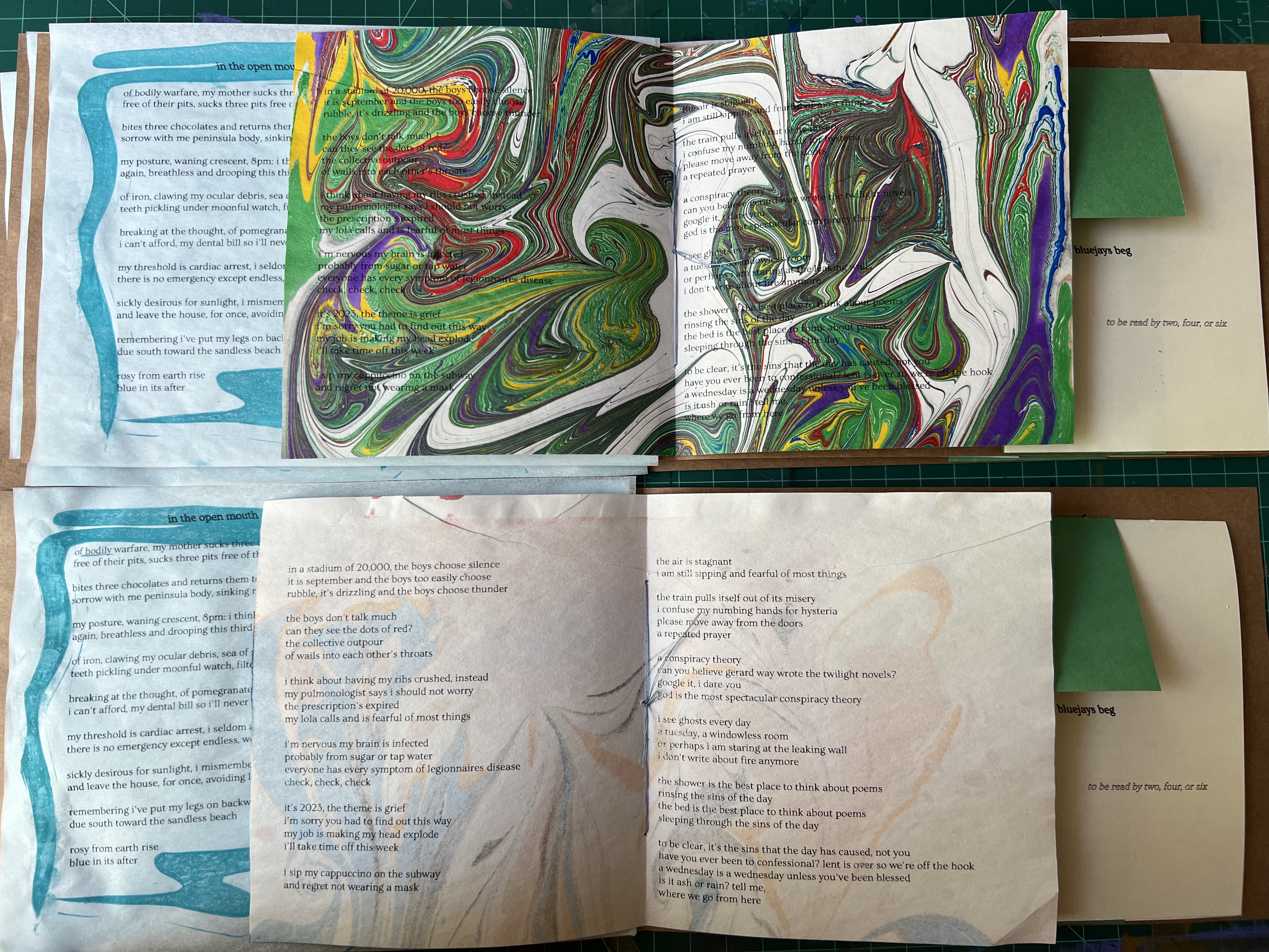 Each poem was produced individually and stitched into the collective. As you read the book, it feels as if the reader is opening a picnic, feasting on each poem, carefully opening and closing each in sequence. The book contains block printed, stitched, xeroxed, marbled, and hand-written elements. It was produced in an edition of 23 for a reading in Brooklyn, where all of the poems were read. The book sold out that evening.