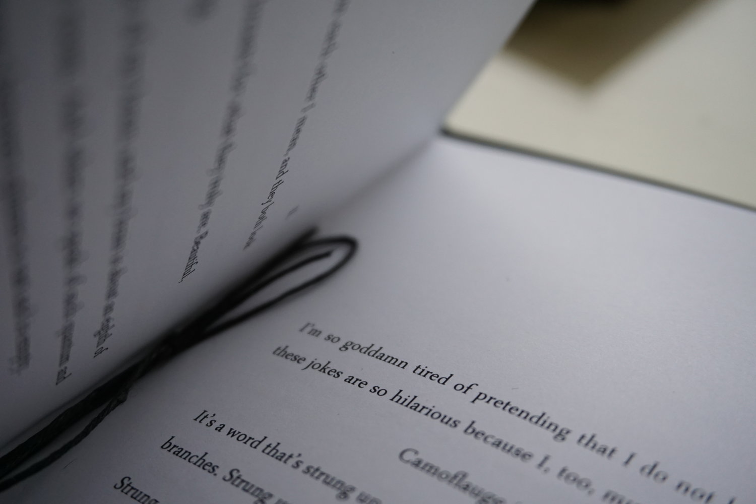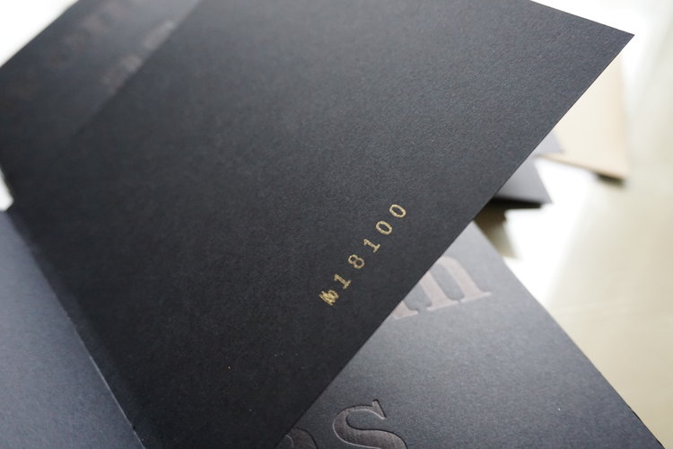 For this book, we chose a 130lb matte black board for the covers, with a soft matte 32lb black interior, balancing rigidity, softness, and an intensity of touch. I used wood block type from the house collection at The Arm Letterpress in Williamsburg, using black ink for the covers and transparent ink for the interior. It is bound with waxed, black hemp thread, and each edition is numbered in gold.